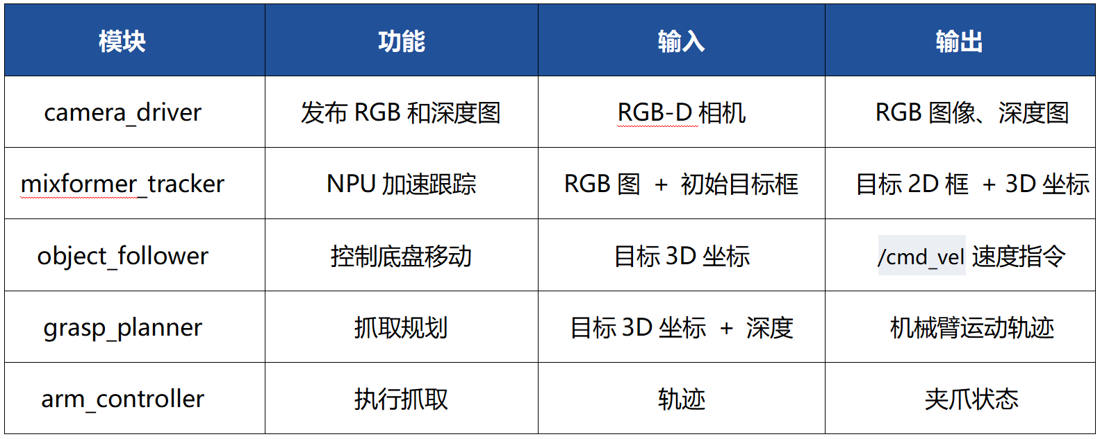 回顾上篇:基于RK3576+ROS2 Humble+SLAM Toolbox+Nav2,我们实现了机器人的建图与自主导航。机器人已经能够“走到哪里”。但真正的智能机器人不仅要“走到哪”,还要“看到并操作”——识别特定物体、主动跟随、近距离抓取。本文将在此基础上,集成深度摄像头,实现机器人核心功能:使用米尔RK3576 NPU加速MixFormerV2进行目标跟踪,替代传统OpenCV算法;移动底盘