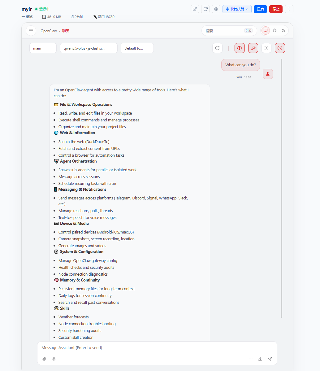 JishuShell不仅部署OpenClaw内核,还预装了针对米尔硬件优化的插件包。例如,支持米尔板载双千兆网口的快速通信插件、适配MYD-LR3576 ISP的摄像头调用驱动等。同时,它全面兼容MCP协议(Model Context Protocol),让OpenClaw能直接读取本地Excel数据、调用飞书API或控制局域网内的Modbus设备,真正做到“部署即可用”。