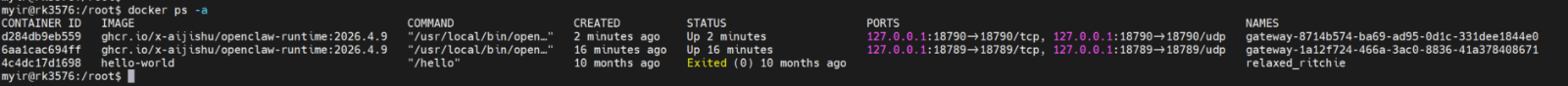 针对工业级应用中对系统稳定性的极致追求,JishuShell引入了容器化部署方案。通过Docker沙箱,OpenClaw及其所有依赖被严密隔离在独立空间中。这意味着,即使AI模型在运行中出现异常或内存溢出,也不会导致宿主机(米尔RK3576核心板)的主进程崩溃。这对于7×24小时不间断运行的工业边缘网关至关重要。