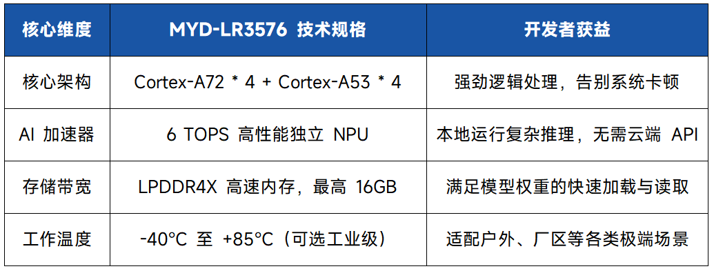 作为方案的硬件基石,米尔RK3576核心板在设计上充分考虑了AI Agent的运行需求。其4+4的核构架提供了极强的多任务处理能力,能够在一边运行大模型逻辑的同时,一边处理高清视频流。其工业级的可靠性保障了在严苛环境下的稳定输出。