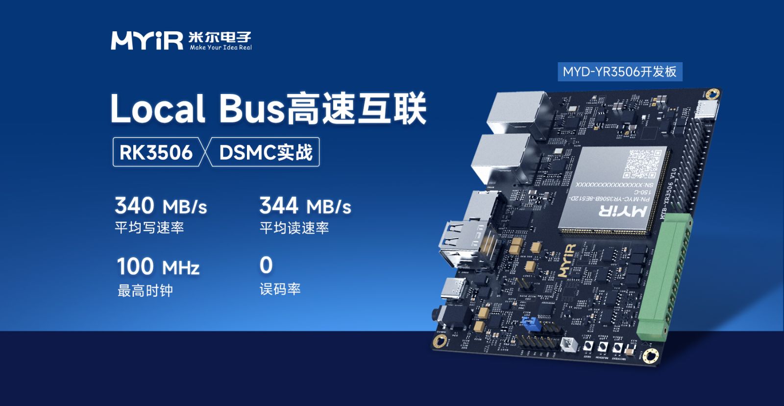 在工业控制场景中,芯片间的高速数据交互是一个核心需求。传统方案要么依赖串口/网络等低速通道,要么需要昂贵的共享内存架构。米尔RK3506核心板的DSMC接口提供了一种新选择——通过Local Bus协议,用少量引脚实现跨芯片的高速地址空间访问。本文基于MYD-YR3506 Host+MYD-YR3506 Slave的实板联调验证,确认DSMC Local Bus链路能够稳定建立,并在512B、8-