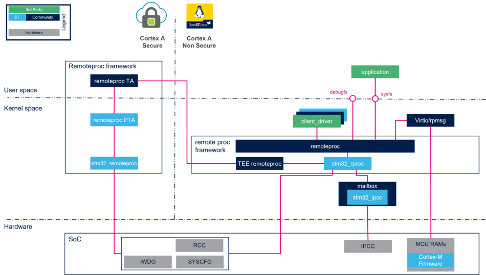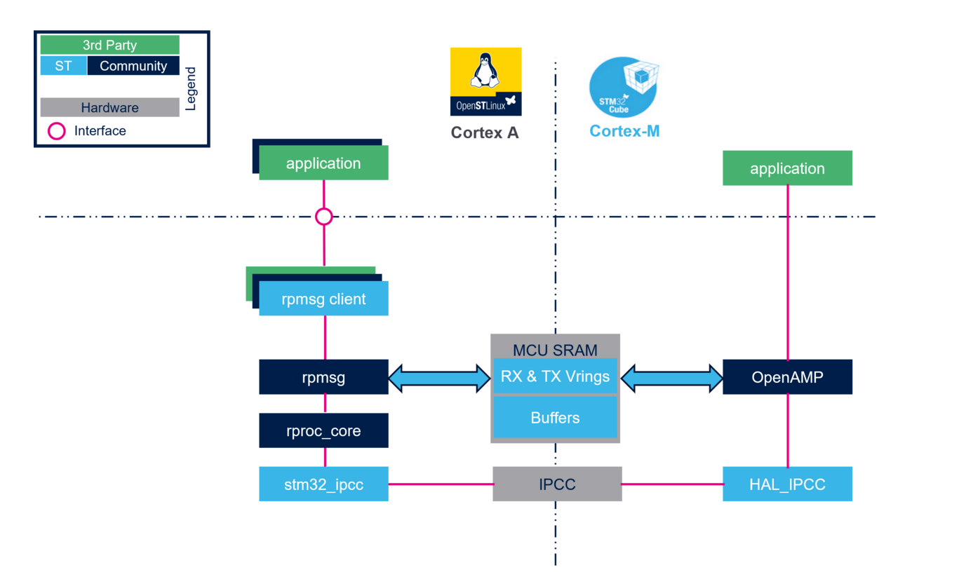 消息服务基于共享内存,使用RPMsg 和 Virtio 框架,RemoteProc框架则控制远程处理器生命周期。信号通知( Mailbox )服务则基于内部IPCC( Inter-Processor communication controller ),ST提供 OpenAMP相关库。