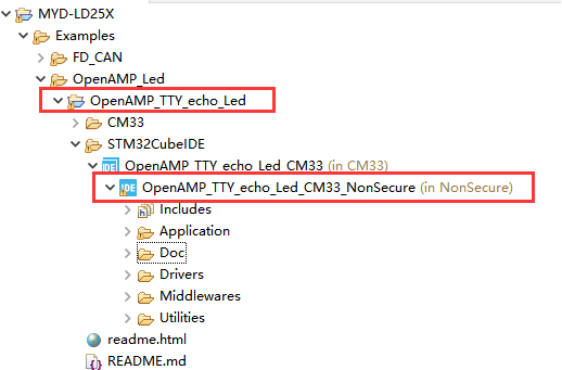 在IDE中导入OpenAMP_TTY_echo_Led例程,导入完成后如下所示: