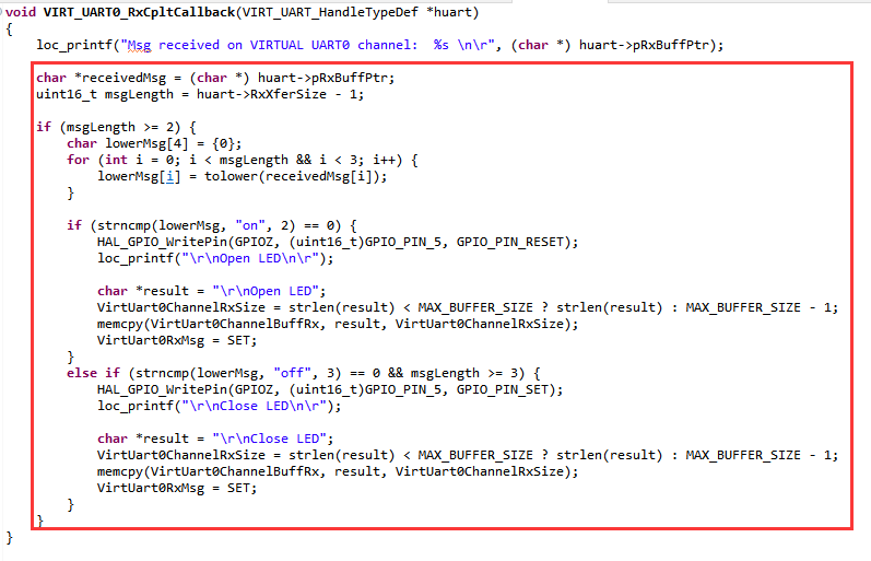 该例程由官方例程OpenAMP_TTY_echo修改,主要修改即为下图中虚拟串口回调函数的框选部分: