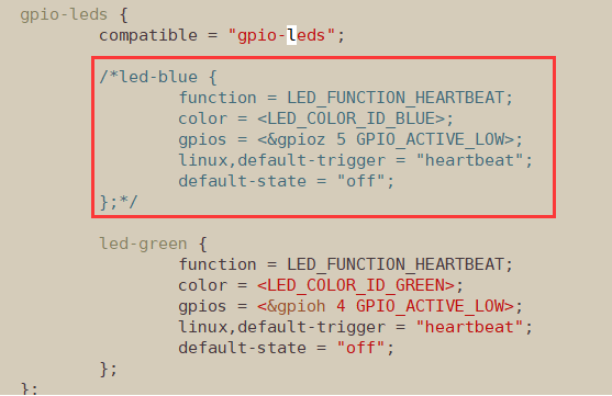 在构建前需要将开发板设备树中的gpio_led的蓝灯关闭,关闭A核占用,设备树中修改位置具体如下: