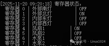 设备状态监控:周期性(10 秒)自动读取 8 路设备(灯光、风扇、水泵等)状态,支持手动触发刷新,状态通过 GUI 实时可视化展示。