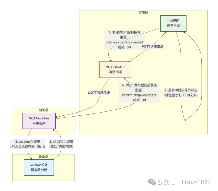 控制指令流程:云平台 GUI 发送指令→MQTT 传输→网关协议转换→Modbus 写请求→终端执行→状态同步反馈。