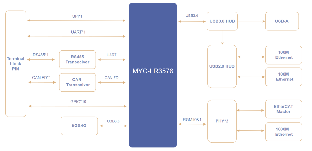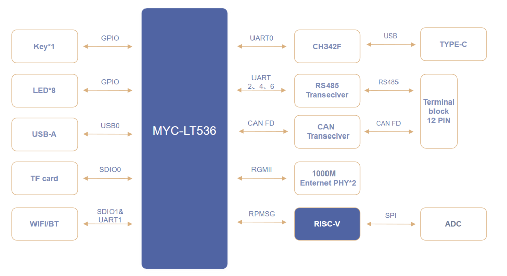 极致接口集成,简化设备组网:在43mm×45mm、LGA252Pin的精巧封装内,MYC-LT536引出17路UART、4路CAN-FD、3路千兆以太网,16bit Localbus等海量工业接口。单颗核心板即可搭建大规模设备网络,大幅减少外围扩展器件,从源头简化硬件设计、提升系统可靠性并优化整体成本。
