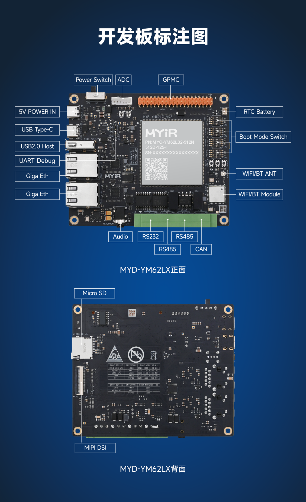 搭载2路千兆网口,1路MIPI DSI 接口,1路音频输入输出接口,1路USB OTG TYPE-C接口,1路USB HOST TYPE-A接口,1路Micro SD接口、1路带隔离的CAN由凤凰端子引出、2路RS485由凤凰端子引出、1路RS232 凤凰端子引出,4路ADC接口由排针引出,GPMC接口由2*20 PIN排针引出。