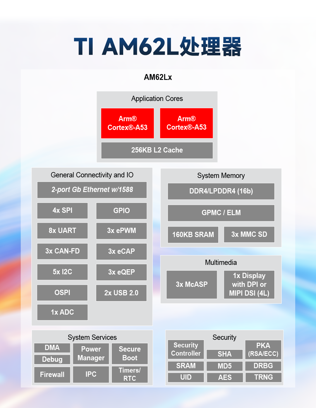 Ti AM62LX处理器专为成本敏感、功耗受限的嵌入式工业应用设计。配备双核Cortex-A53@1.25GHz,2路千兆以太网接口、3个CAN FD接口、2个USB2.0、3个SDIO3.0接口、8个UART接口,5个I2C,4个SPI,1个16bit GPMC,1个24-bit RGB/MIPI DSI分辨率1920x1080@60fps。